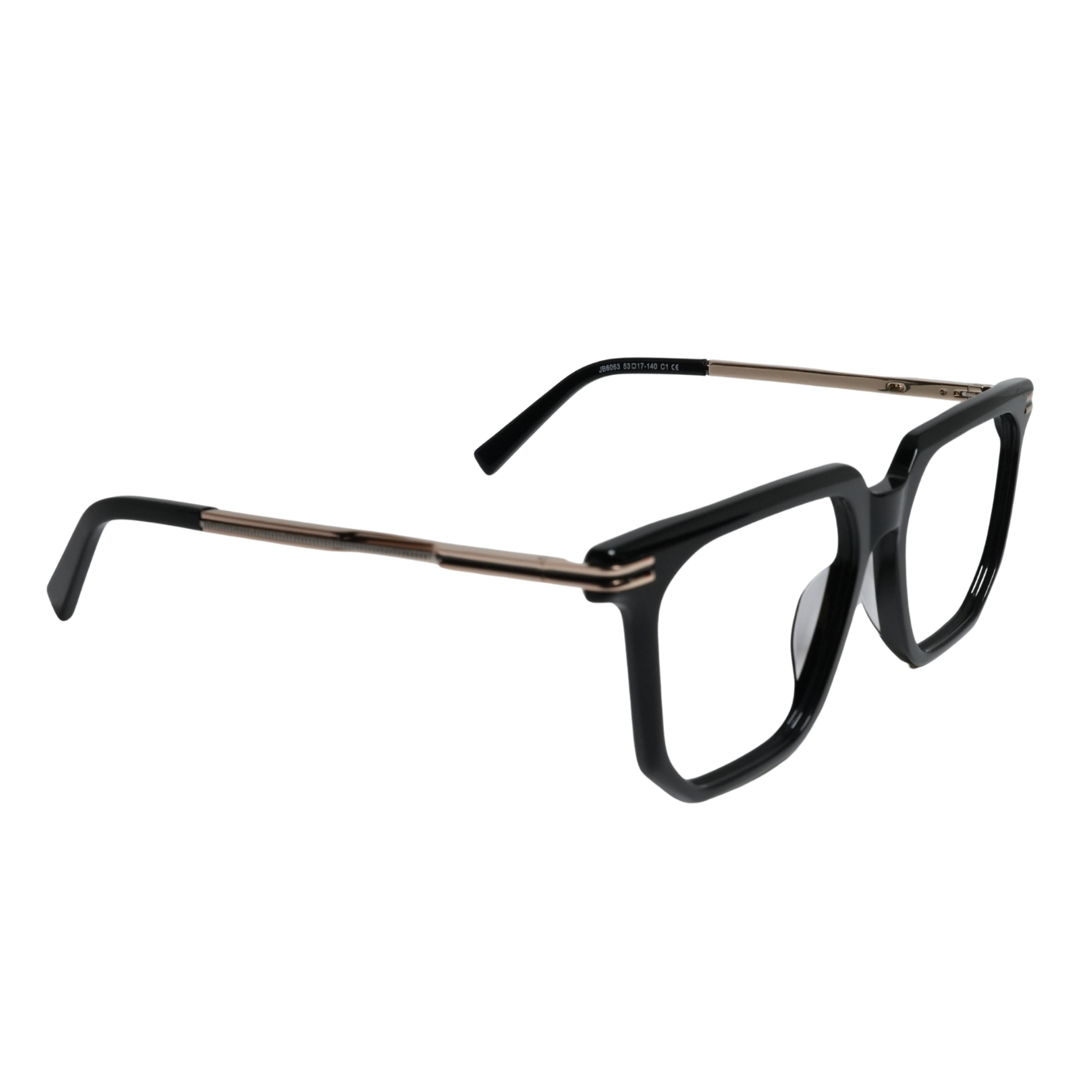 Clear acetate solid black front paired with designer gold color temples for a modern, lightweight, and stylish eyewear look.